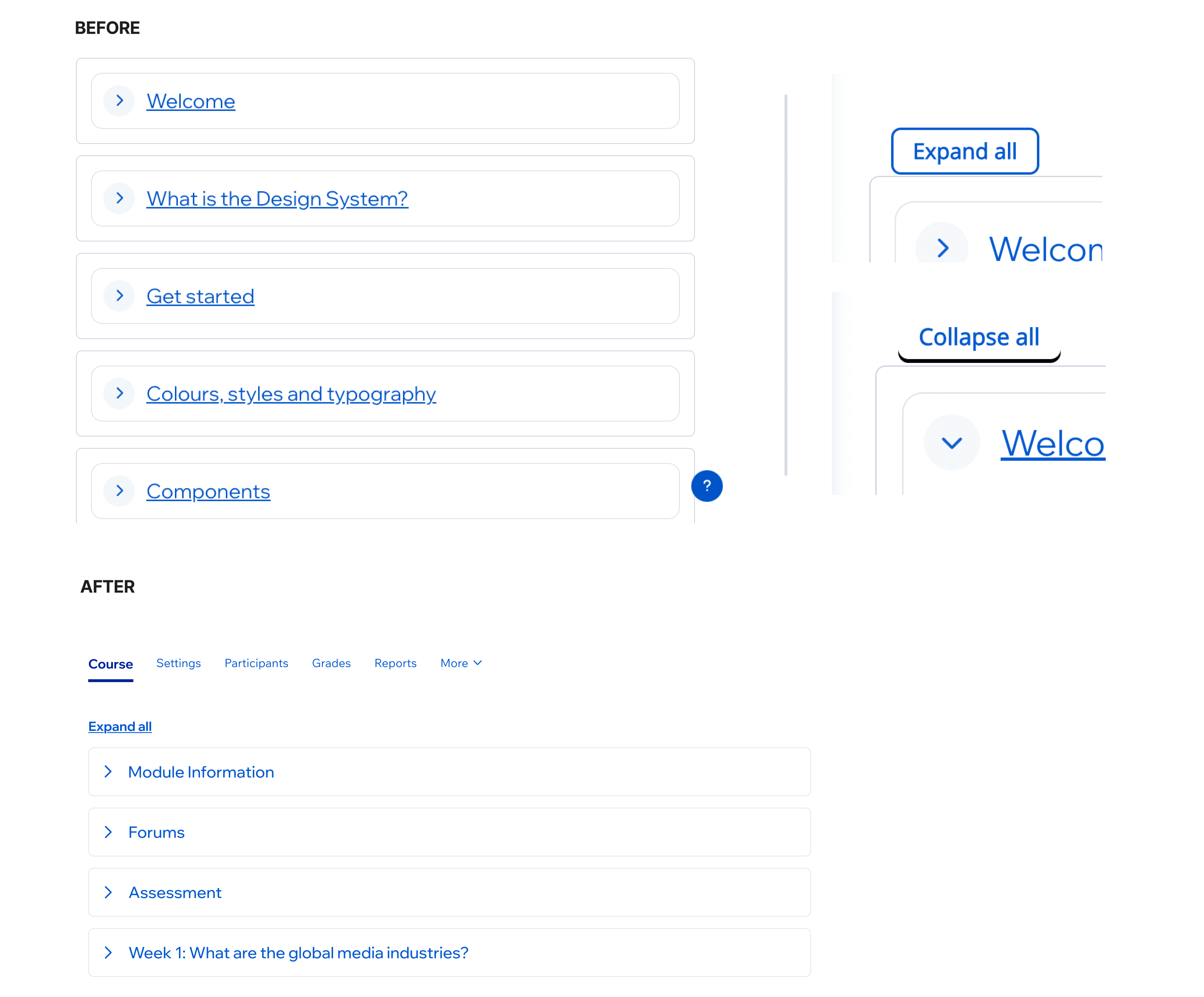 My approach was restraint. I demoted the expand/collapse controls to a lighter tertiary treatment so they supported the content rather than competing with it. Removed the extra container lines so the accordion list read as a single continuous component. Applied the typography scale consistently so hierarchy was readable at a glance.