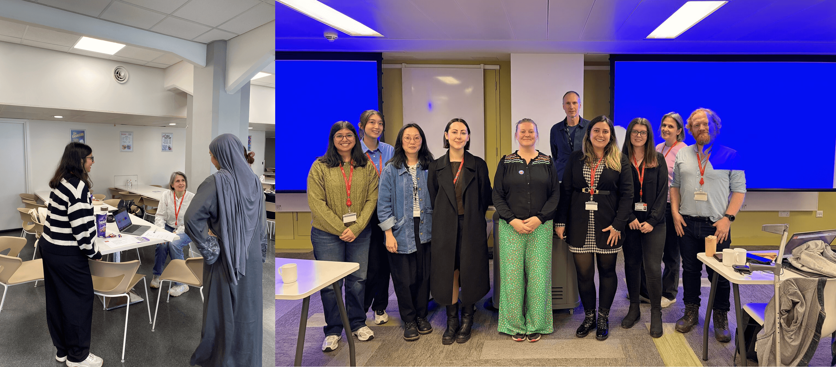 On-campus guerrilla testing, June 2025 (left) and presenting UX work to other Universities in London, November 2025