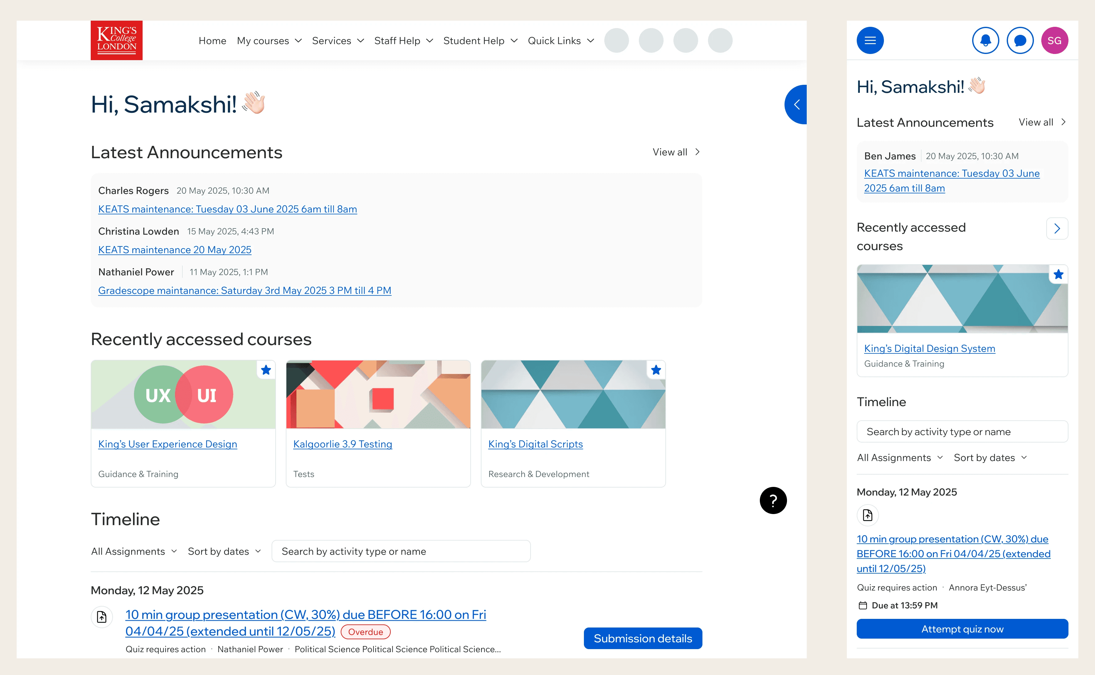 I cared about the small things, the corner radii, the spacing rhythm, the subtle hierarchy decisions, more than the visible scope of those changes might suggest. King's is a major institution that students invest significantly in, and KEATS is the product they sit with daily. The level of care the Dashboard showed in those details was a small, visible signal of how seriously the institution took the experience it was offering. That mattered to me.