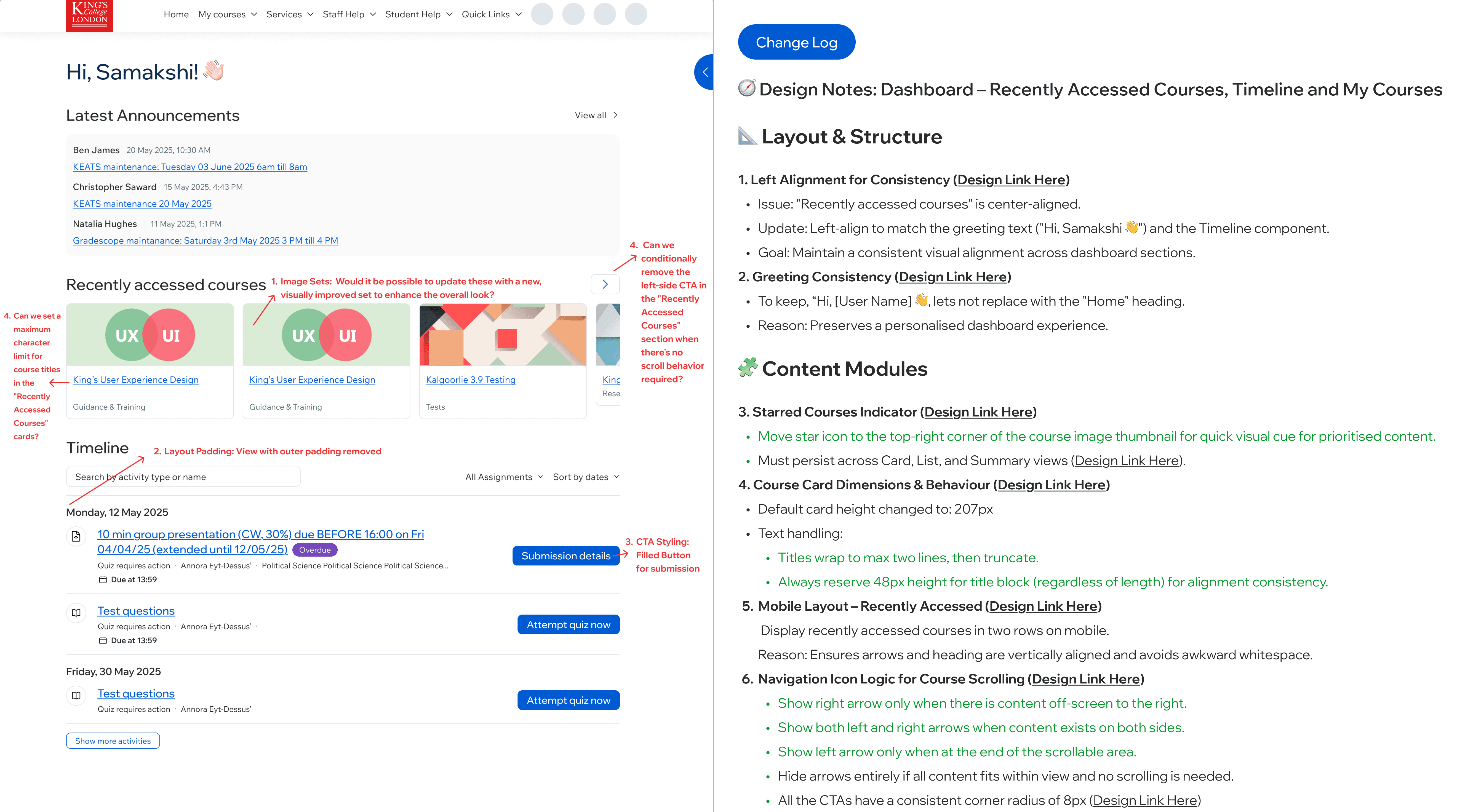 The Design Notes document that went with handoff captured the result of that thinking: every change with a Figma link and a short rationale, left alignment for the greeting, the 48px reserved height for course card titles, the conditional arrow logic, the 16px timeline spacing, the 8px corner radius on all CTAs. On a platform where we couldn't afford a single wrong build, removing back-and-forth at the build stage was as much a part of the work as the screens themselves.