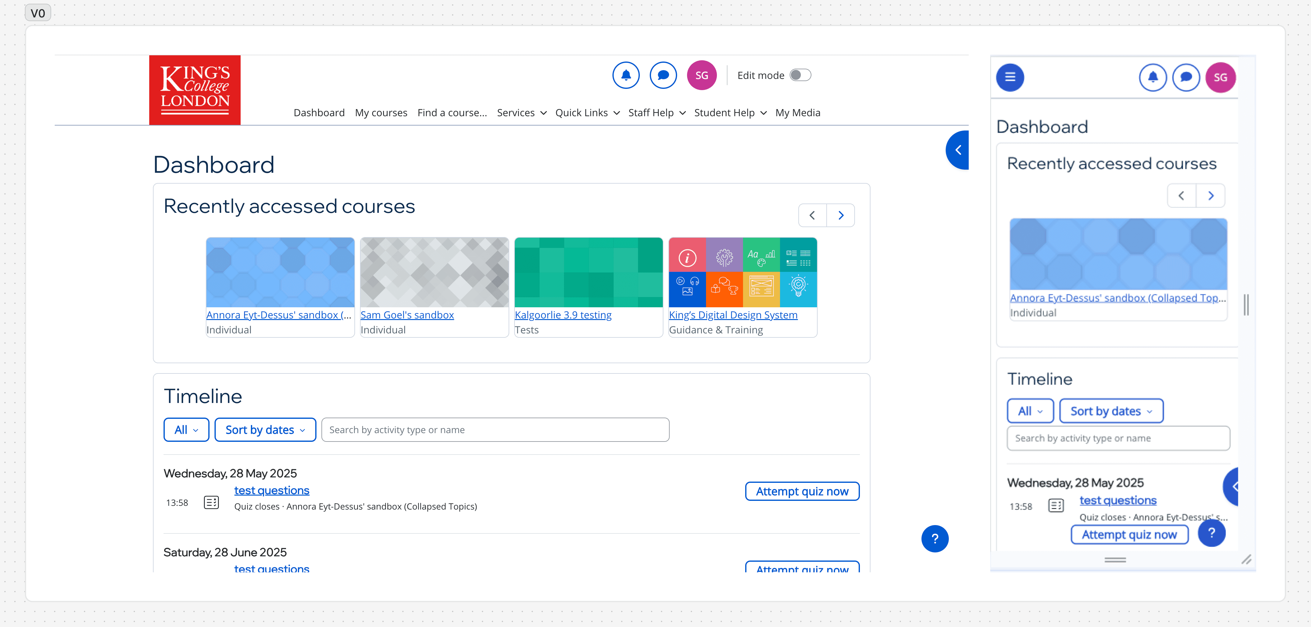 I explored it as a variation on V1. The question was whether a Latest Announcements module could earn a place on the Dashboard without displacing the two elements the research had already prioritised: Recently Accessed Courses and Timeline.