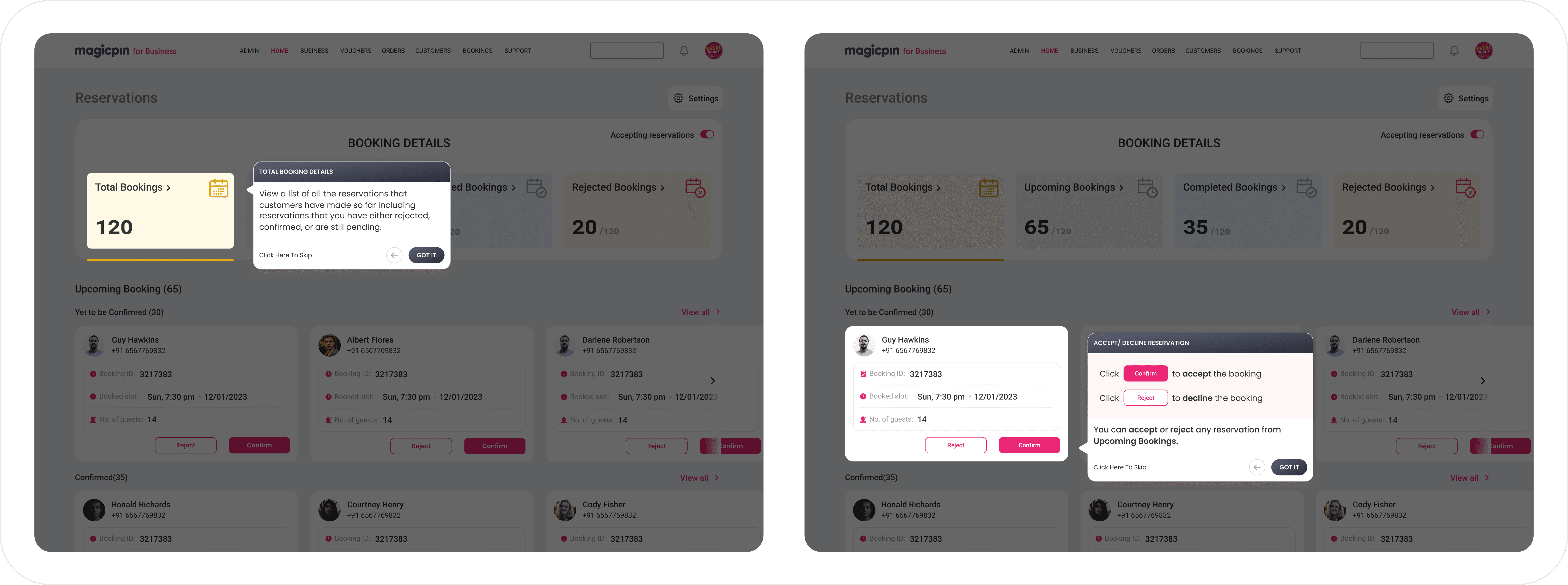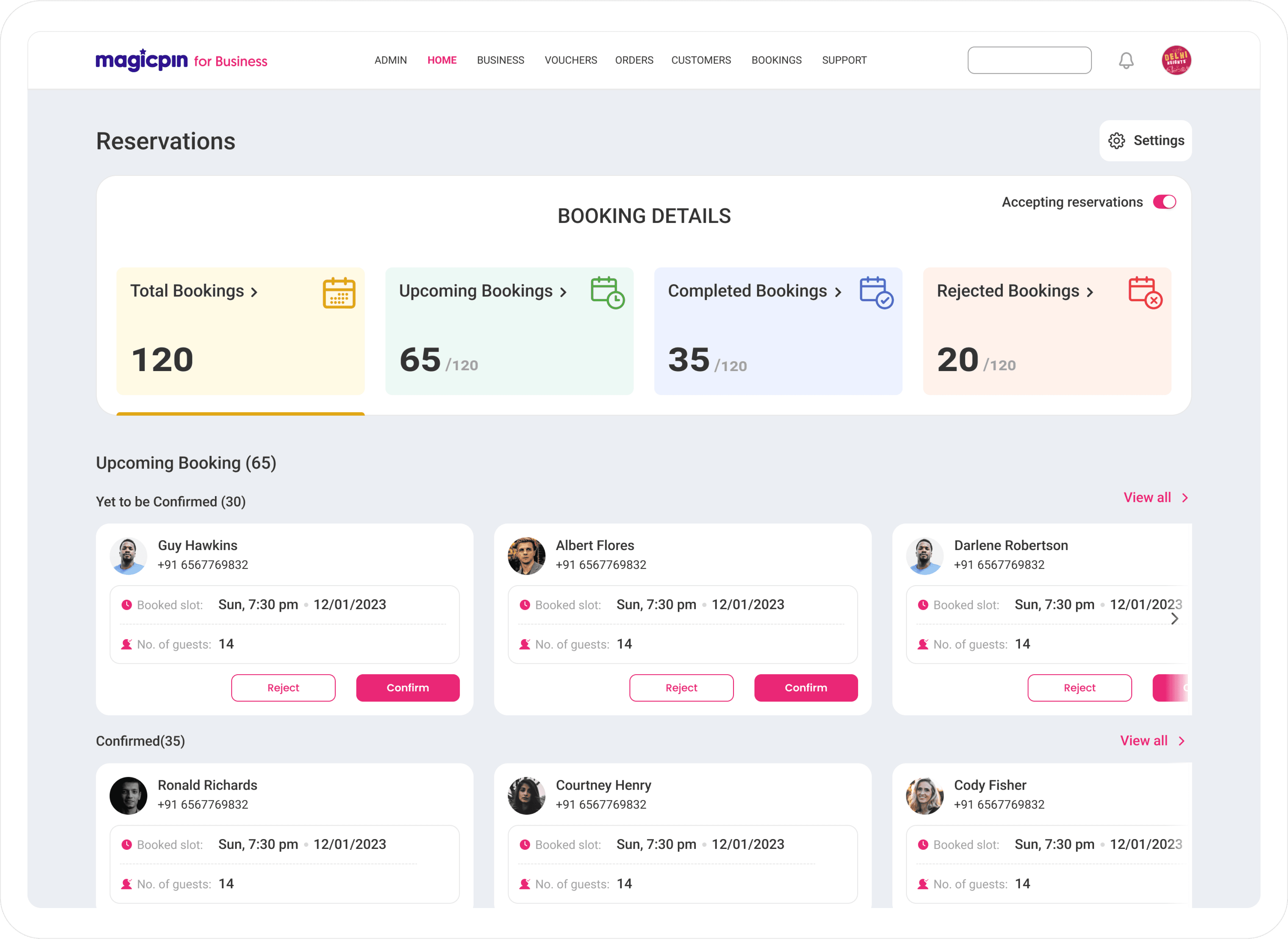 Craft an intuitive dashboard for merchants, empowering them to review each booking effortlessly. The design should facilitate easy confirmation or rejection of reservations based on their specific requirements.