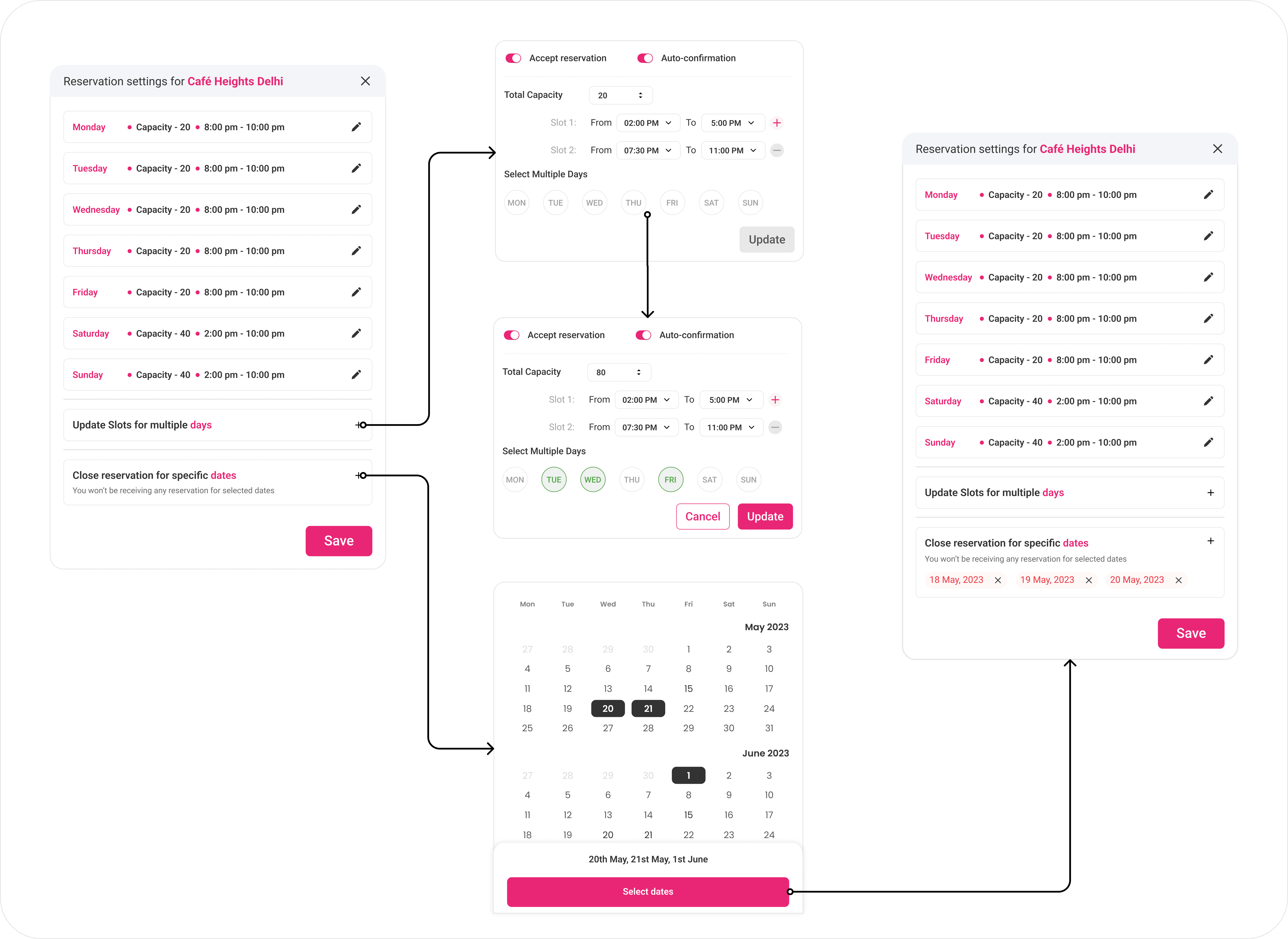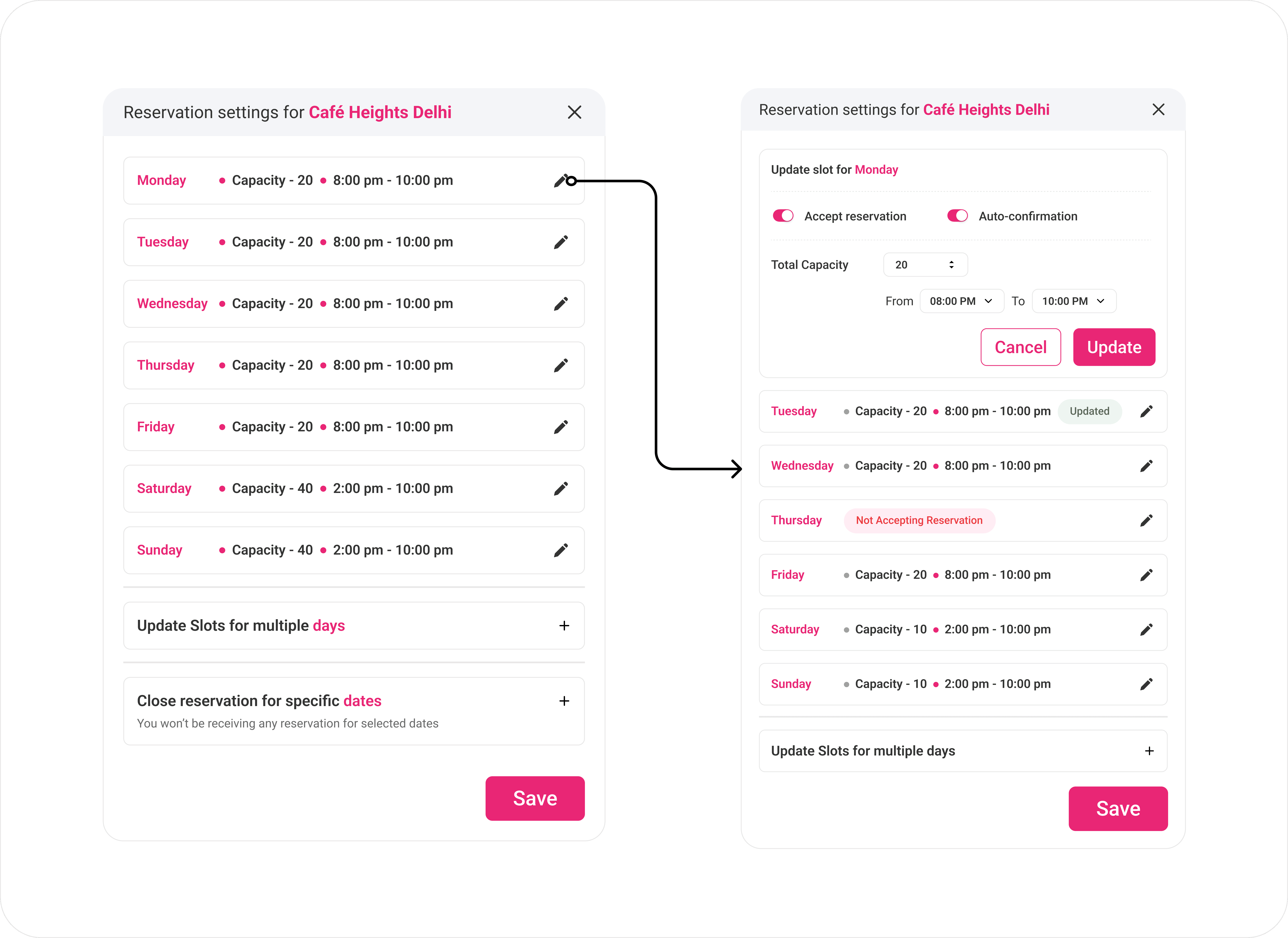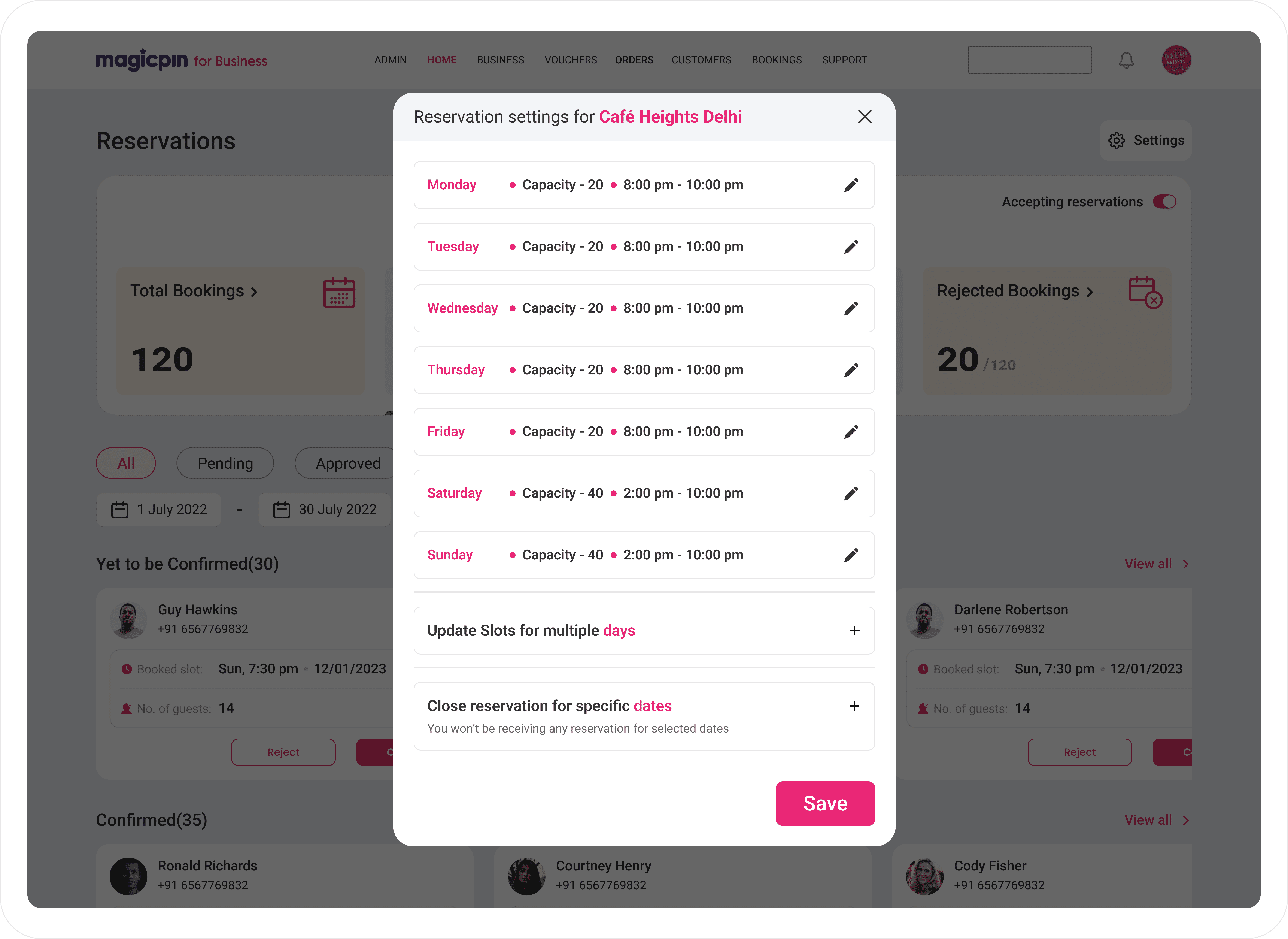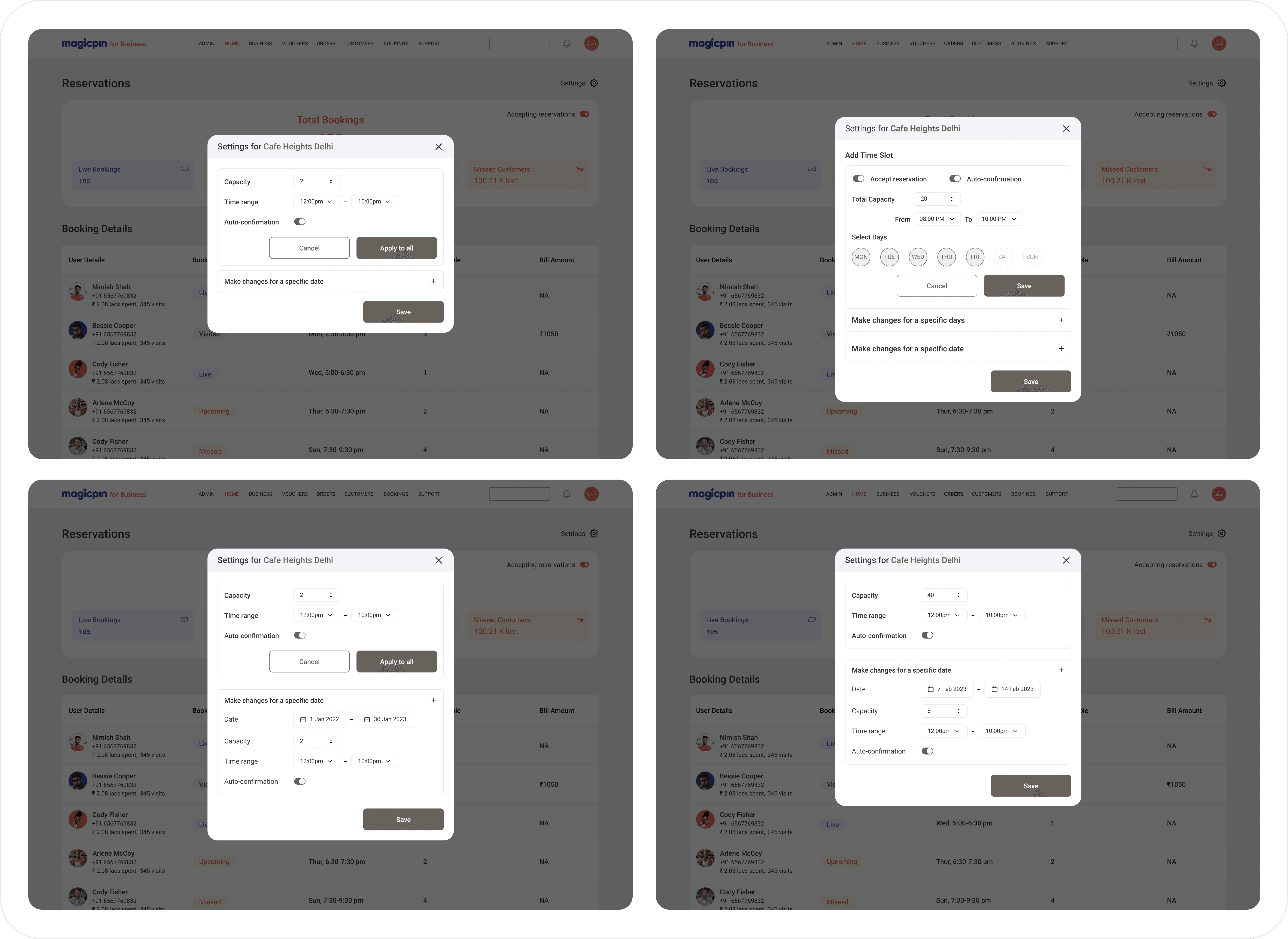 This section is a sticky component that helps users quickly change their restaurant settings. The main goal of this screen is to review or modify seating capacities and service hours. It also provides separate options for altering timings for multiple days and closing the reservation for specific dates in a single click, decreasing the user's friction to meet their goals.