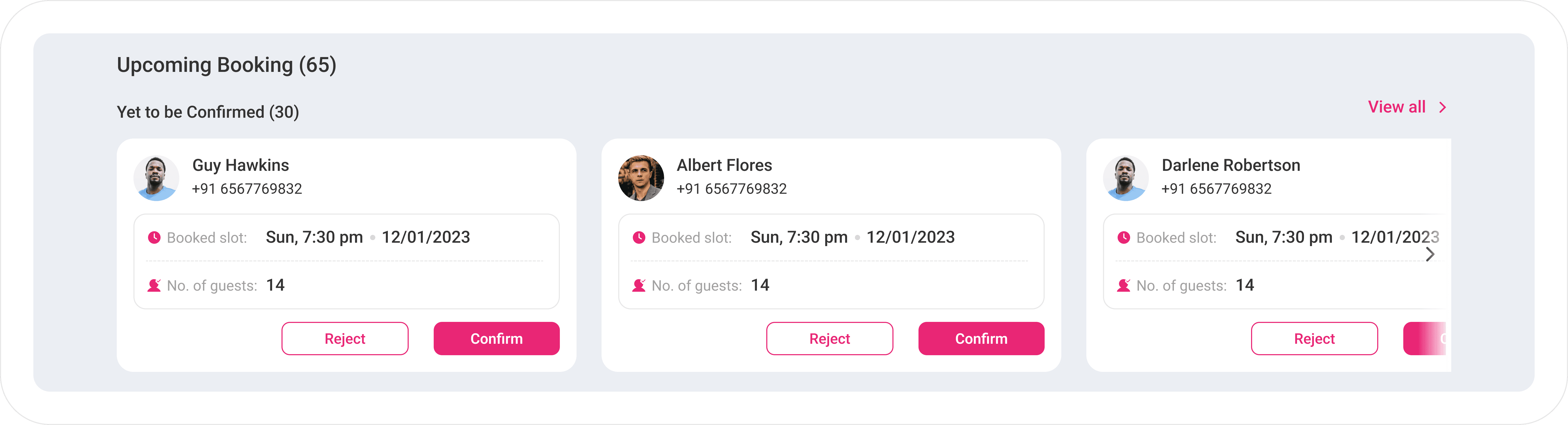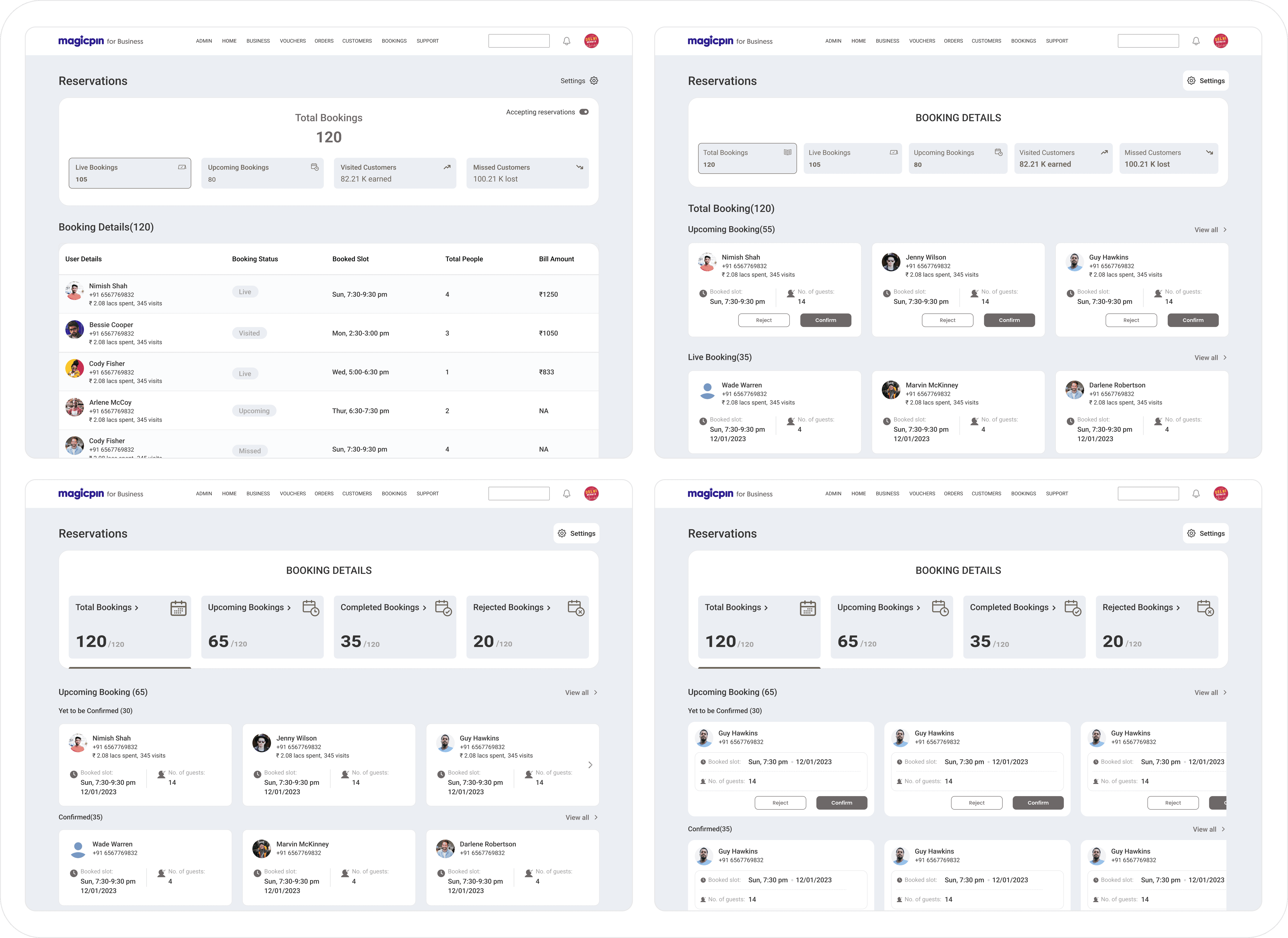 The card components on this interface are meticulously designed to serve as information hubs for each reservation, offering a snapshot of the customer’s details paired with immediate, actionable call-to-actions (CTAs). At a glance, you’ll receive essential information about the user — such as their name, contact information, booking time, and the number of guests. This concise yet comprehensive display ensures you have all the pertinent data to make informed decisions swiftly.